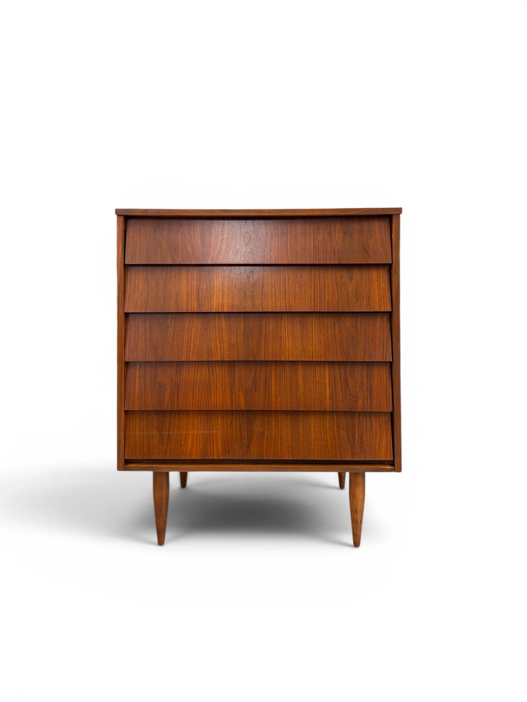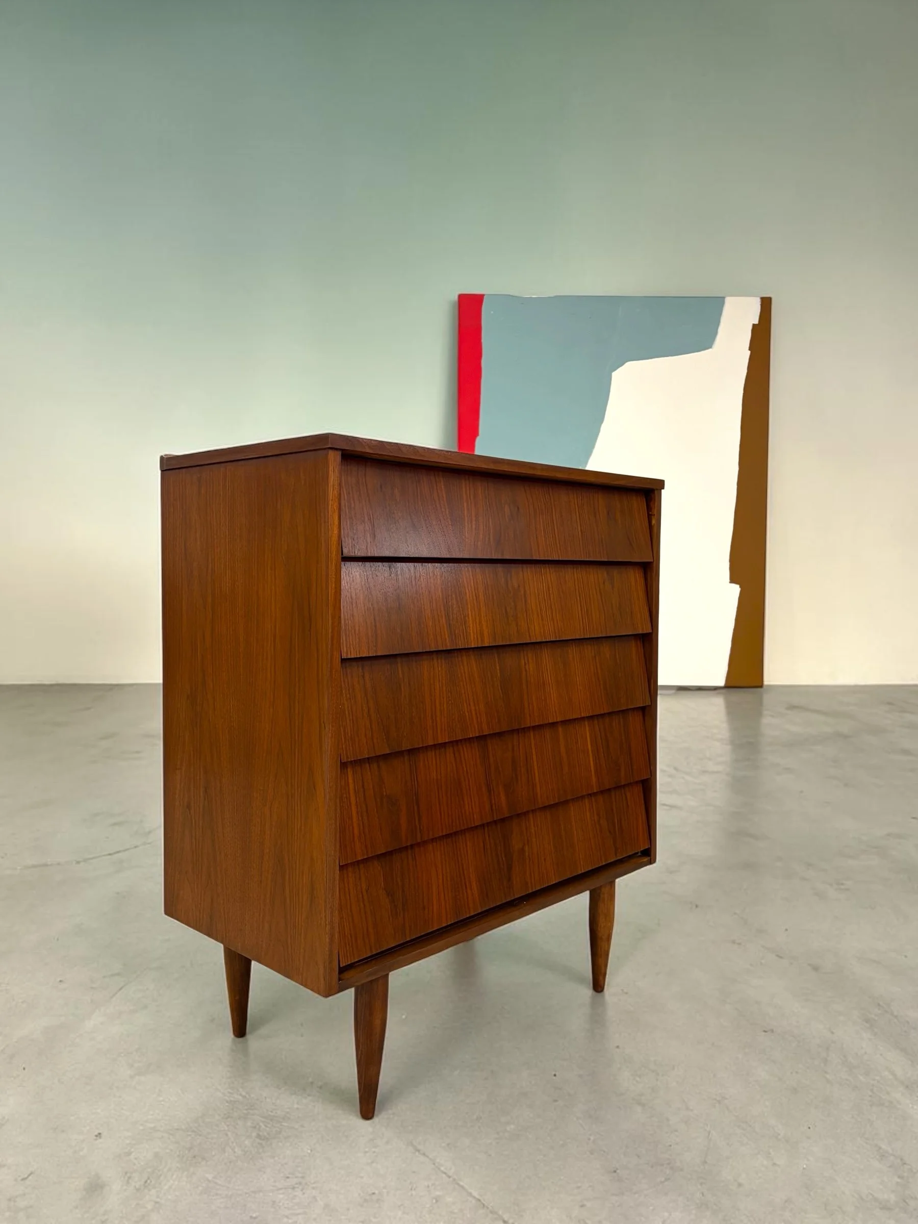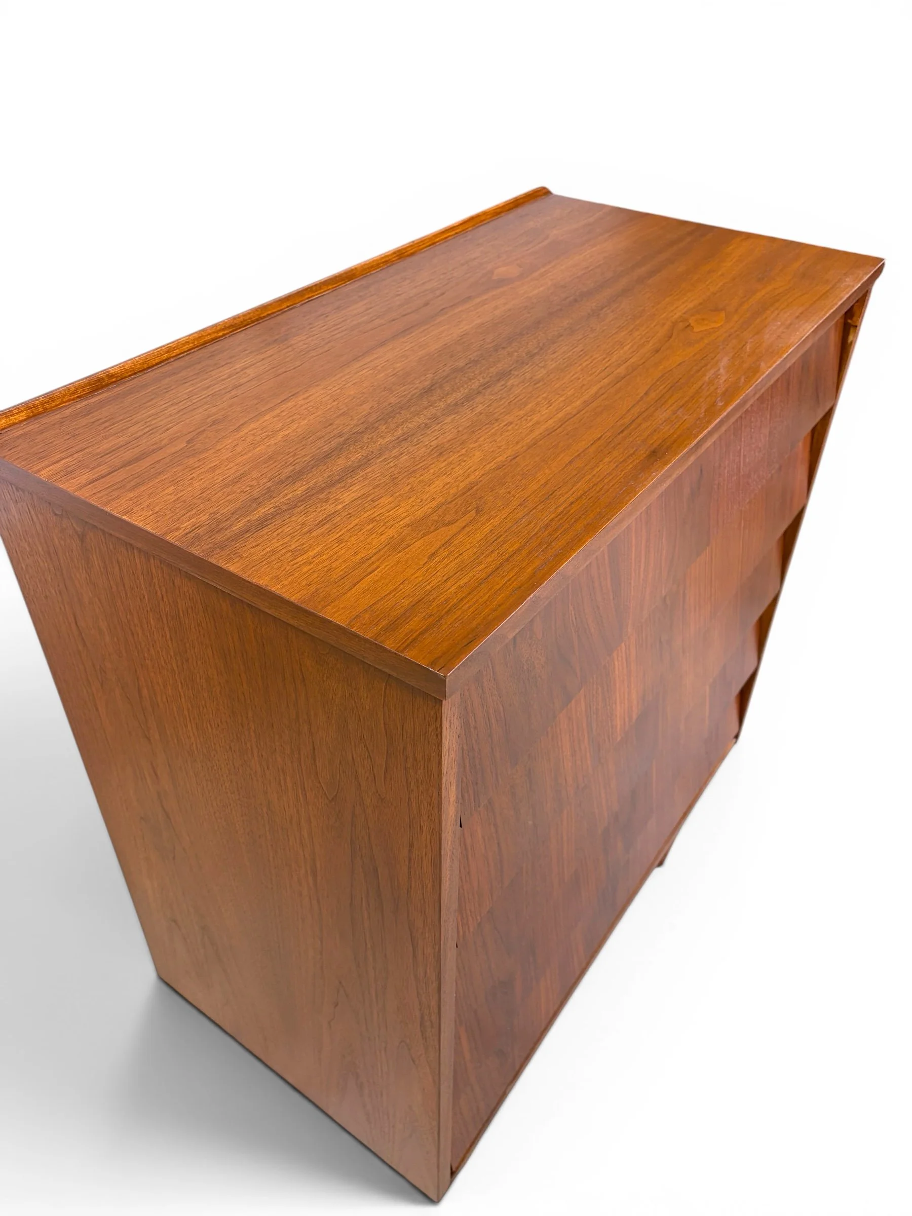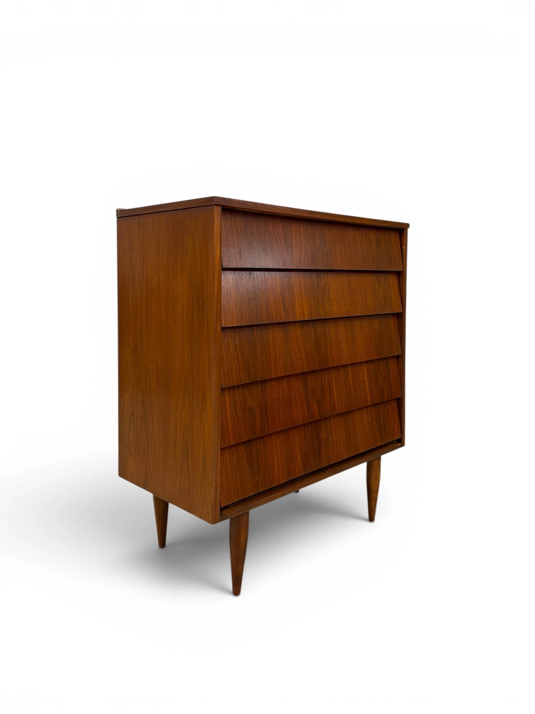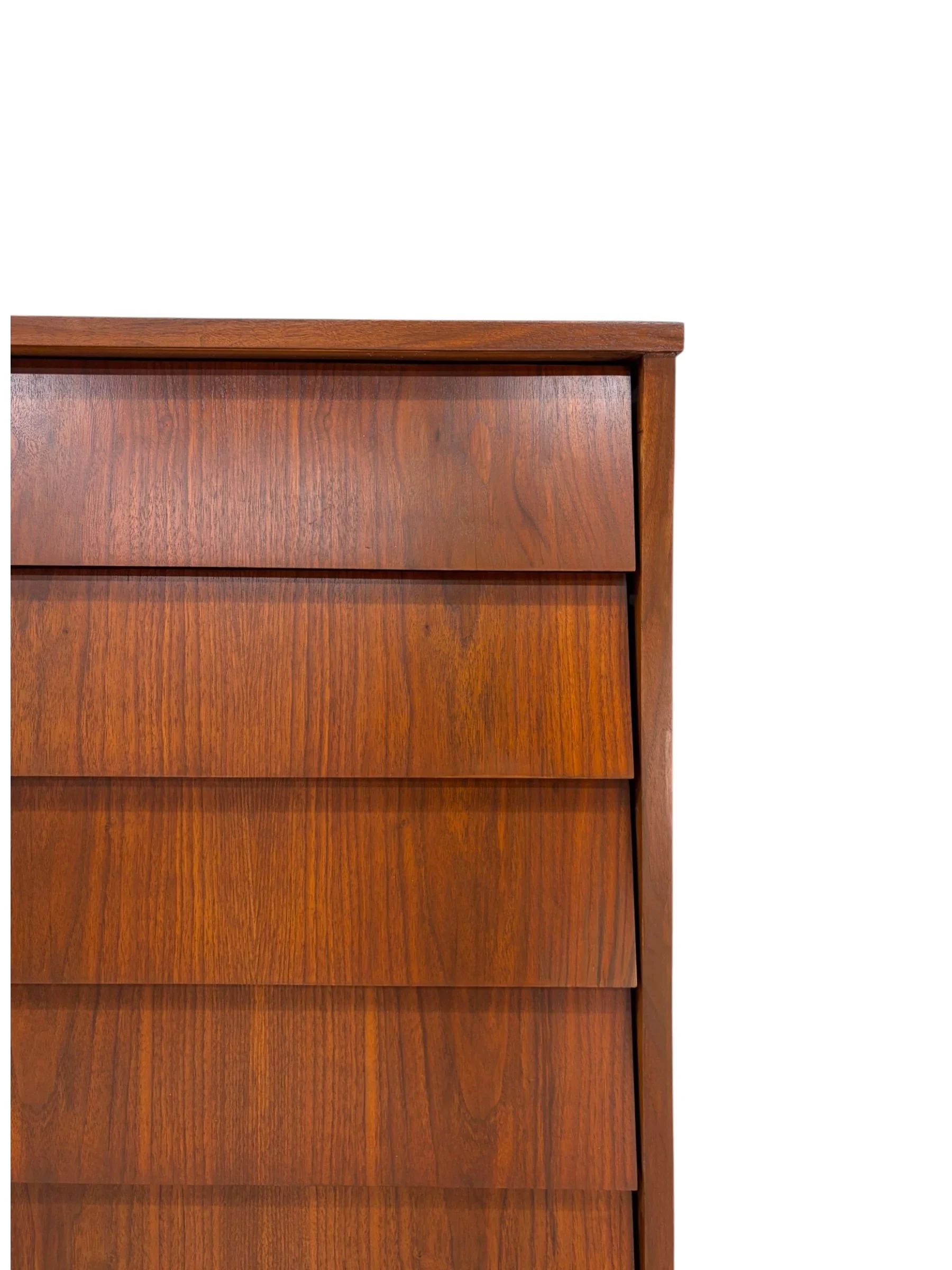 Vintage tiered dresser with walnut veneer over solid wood substrate. This piece has been stripped, stained and sealed and is in excellent vintage condition with no notable flaws. Beautiful, simple design.